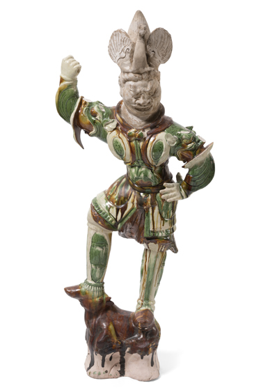 Ceramic figures of tomb guardians kept evil spirits away from the deceased. This one is a fangxiang in exaggerated human form.