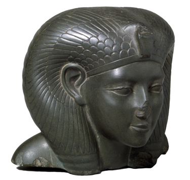 This Egyptian queen is shown wearing a vulture cap with a rising cobra. The vulture was associated with the goddess Nekhbet and the cobra with the goddess Wadjet.