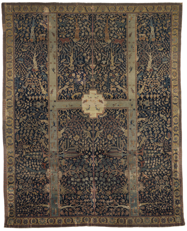 The garden design on this carpet is crammed with shrubs and trees, animals and birds intersected by water channels and a pool full of fish and ducks.