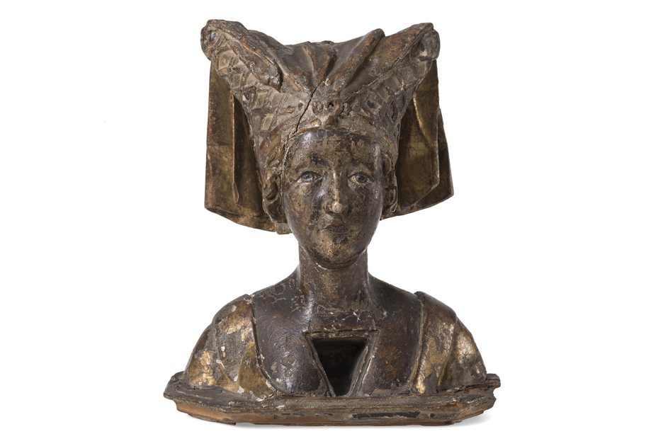 Saints are often shown wearing fashions of the artist’s time. This extravagant headdress was fashionable for rich and important women during the late 1400s.