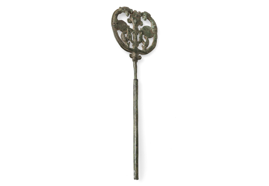 Hairpins were the finishing touch on a woman’s beautiful hairstyle. The top of the pin shows the Sky God defending himself against two dragon-like animals.