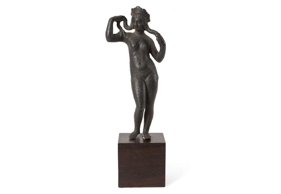 Aphrodite, the Greek goddess of love, plays with her long flowing locks of hair, often used as a sign of her beauty.