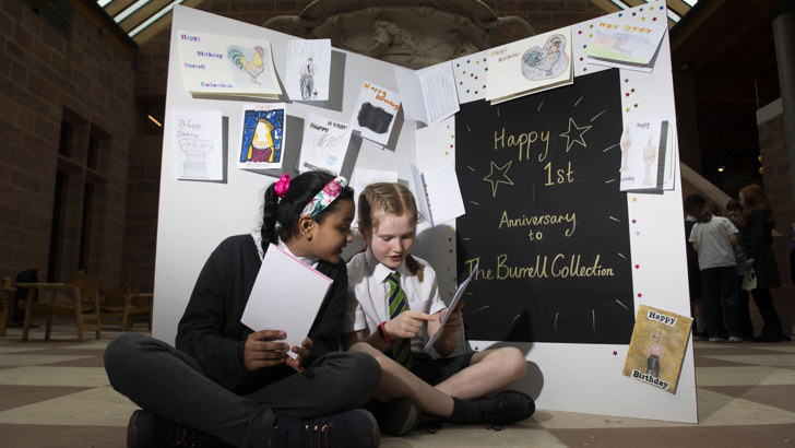 To help mark the occasion children from a local school, St Conval’s Primary, were at the museum preparing for a longer visit in April. They took time out to create sustainable cards to celebrate the first anniversary of the Burrell reopening and enjoy some cake.
