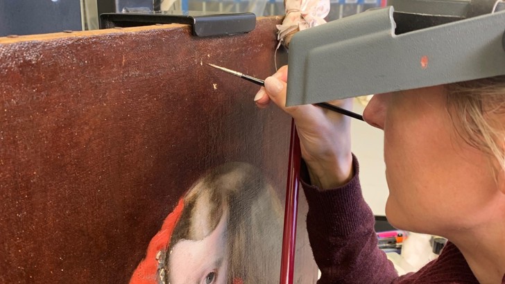 Suzanne in the conservation studio at Glasgow Museums Resource Centre, preparing 'Margaret Theresa, Infanta of Spain' by Juan Bautista Martinez del Mazo (c1665), for redisplay at The Burrell Collection.