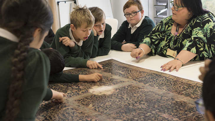 Header image: Caroline working with a school group on tactile testing for the new displays in The Burrell Collection.