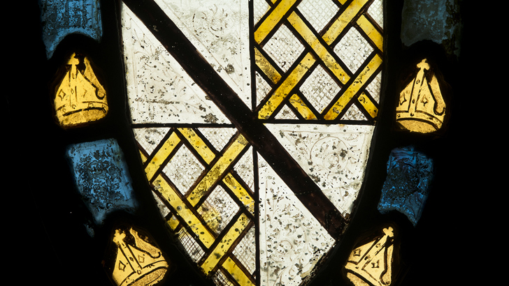 Our stained glass coat of arms has little bishops’ mitres – their distinctive headwear – painted round the edge of the shield. But looming largest of all in the middle is the coat of arms of a very powerful family in medieval England: the Despensers. They were an interesting bunch. One father and son duo, both called Hugh, had benefited from the turmoil of the troubled reign of King Edward II. They got in favour with the king and started to take land and money by devious means. They were so hated by their enemies that the father was hung, drawn and quartered, then beheaded and the remains sent to different corners of the kingdom to be put on show. The same thing happened to Hugh the Younger, but he was paraded on an old nag with his coat of arms displayed upside down. By doing this, all would know that he had not behaved as a chivalrous knight ought to.