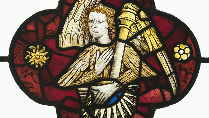 Stained glass panel ‘Angel carrying a column’. Made in Norwich, England, 1400s and later. (accession number 45.46)